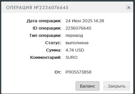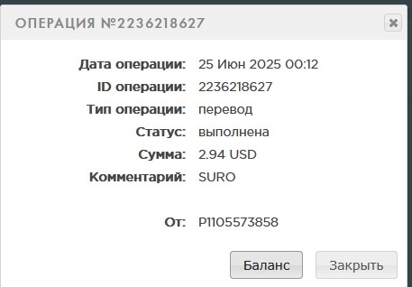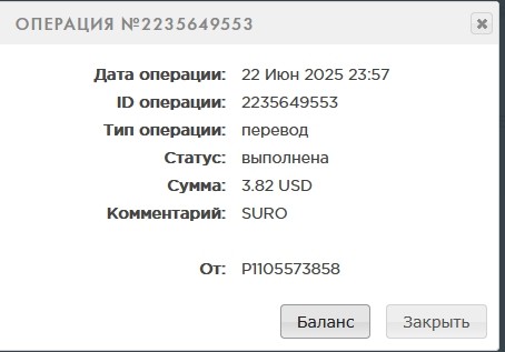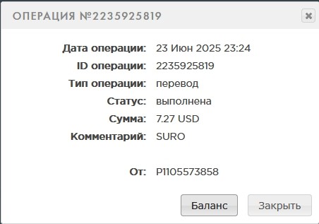 11. Операция №2236485461 Дата операции: 25 Июн 2025 22:12 ID операции: 2236485461 Тип операции: перевод Статус: выполнена Сумма: 0.4 USD Комментарий: SURO