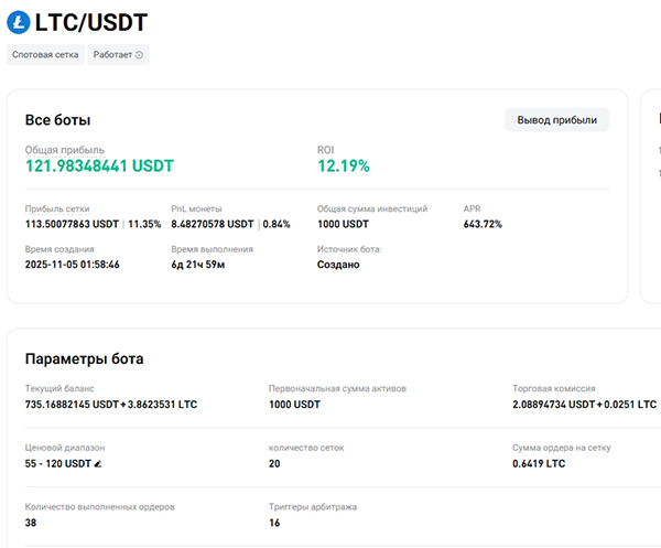 Для примера возьмём запущенный недавно бот по LiteCoin, параметры которого вы можете видеть на скрине