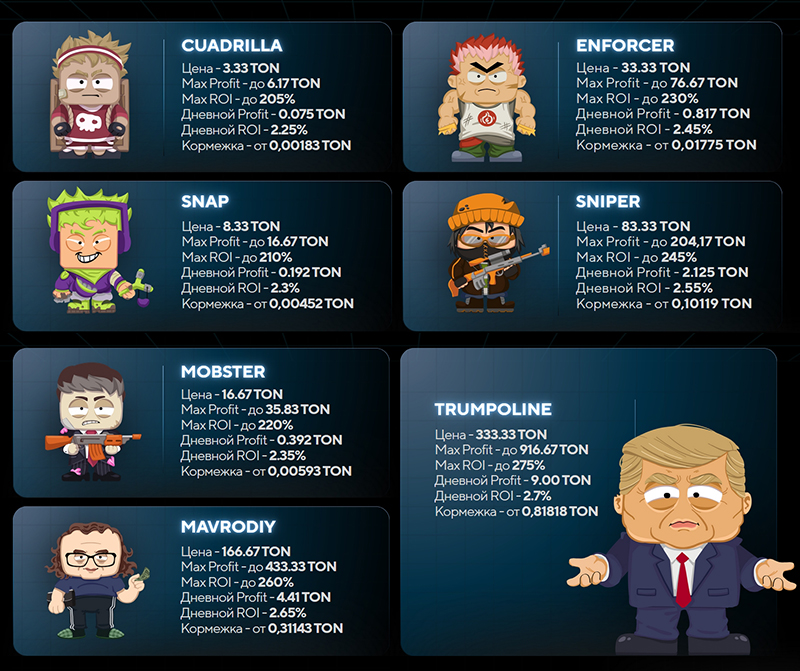 205-275% от вклада за 90 дней, начисления каждый час; важно кормить героев не реже раза в 24 часа, иначе они помрут.