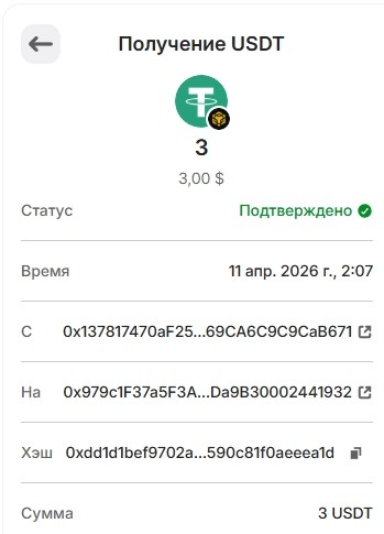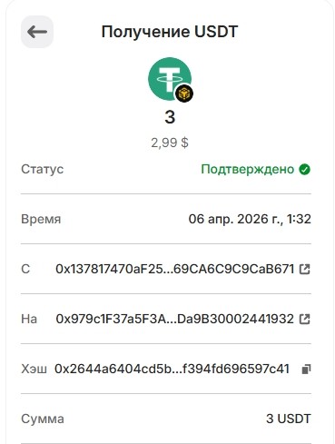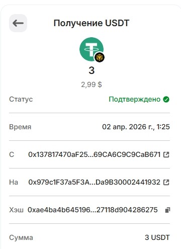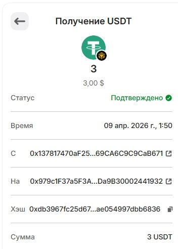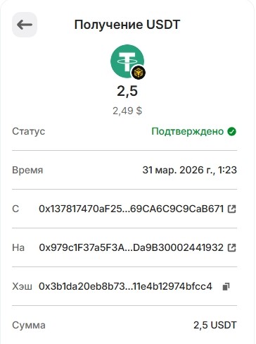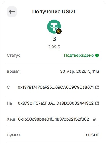 20. 1USDT 29.03.2026 0xa83f9115589e67f9fb60ed037166ba7726f4bf810c86a969d115eebba38a85f9