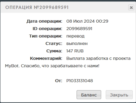 Комментарий: Выплата заработка с проекта MyBot. Спасибо, что зарабатываете с нами!